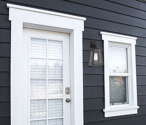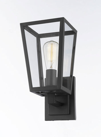 MODERN FILAMENT CLEAR GLASS WALL SCONCE - GOOD FOR OUTDOOR LIGHTING AND INDOOR USE - WROUGHT IRON VINTAGE BARN METAL INDUSTRIAL URBAN LOFT RUSTIC WALL MOUNT LIGHTING - SIZE: 6""W x 7""D x 13""H This clear glass panel geometric fixture uses Edison-style filament bulbs (included) Overall: 6""W x 7""D x 13""H 1 LIGHT (BULB INCLUDED)