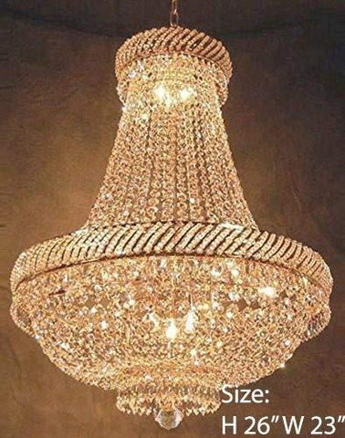 This beautiful Chandelier is trimmed with Empress Crystal(TM) 100% CRYSTAL CHANDELIER, this chandelier is characteristic of the grand chandeliers which decorated the finest Chateaux and Palaces across Europe and reflects a time of class and elegance which is sure to lend a special atmosphere in every home. This item comes with 18 inches of chain.Assembly Required SIZE: W.23 X H.26" 9 LIGHTS.