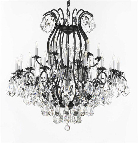 A Great European Tradition. Nothing is quite as elegant as the fine crystal chandeliers that gave sparkle to brilliant evenings at palaces and manor houses across Europe. This beautifully unique version from the Versailles Collection has 100% Crystal that capture and brilliantly reflect the light of the candle bulbs. The frame is all wrought iron, adding the finishing touch to a wonderful fixture. The timeless elegance of this chandelier is sure to lend a special atmosphere anywhere its placed! Please note this item requires assembly. This item comes with 18 inches of chain. size: H36" x W36" 15 LIGHTS.
